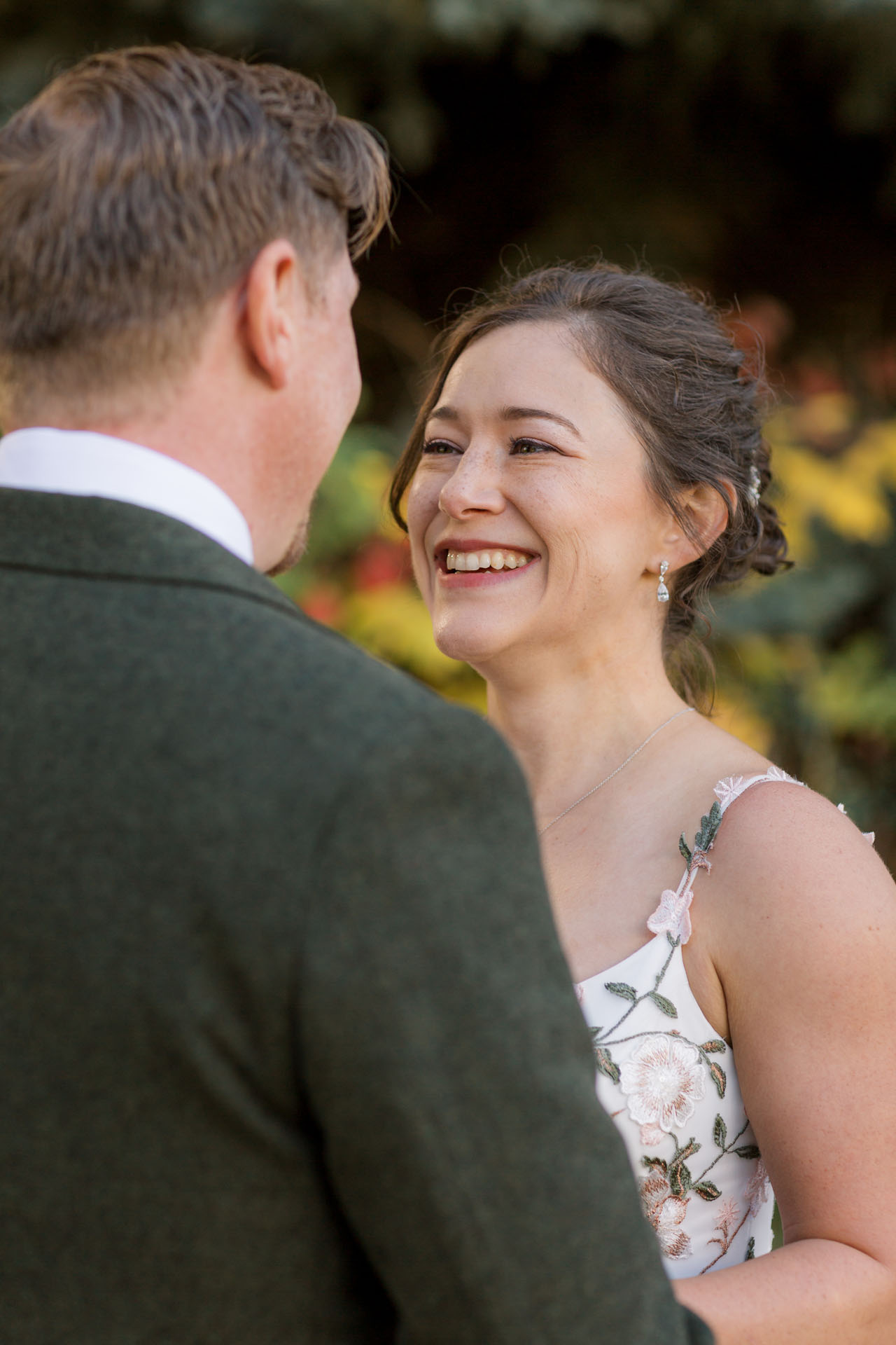 Alexis and Dylan’s friends arrived early to Kathryn Albertson Park to help set up chairs, and even Grandma lent a hand transforming the Rookery into a wedding ceremony space. The whole group spent the morning together sans photographer: making breakfast together, picking flowers from the garden for the bouquet, and getting ready for the wedding. When they arrived at Albertson Park, we took some group photos to commemorate the group gathered, and then began the ceremony. Alexis and Dylan shared personal vows, and their officiant read well wishes to the couple written by everyone in attendance. It was uncomplicated and meaningful, a beautiful way to start their marriage. We took a few photos around the park together as we meandered the winding paths of Kathryn Albertson Park. With fall colors around every turn, we could have spent hours there, but instead Alexis and Dylan walked and talked and enjoyed some time together as I took some photographs of them.
